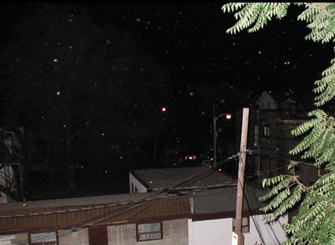 At the risk of being considered a "de-bunker", and I do love a good mystery, please have a look at my images below, and you may draw your own conclusions. I was testing a fairly powerful Metz flash unit with my Nikon 990 digital camera from my back balcony, and took a night shot over the lane. As you can see, there are numerous 'orbs' in the foreground. I truly attribute these orbs to airborne particulates such as insects, city dirt, chestnut tree matter (it was the end of summer, and I was situated under a chestnut tree), or fluff. Obviously there was stuff flying around in the night air that was lit up by the flash in front of the camera lens, and out of focus. Digital noise? Dirt on the lens filter maybe? Or Orbs? Why is it that digital cameras seem to do this more often?