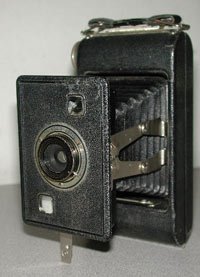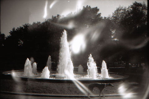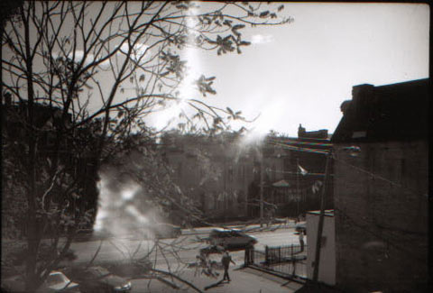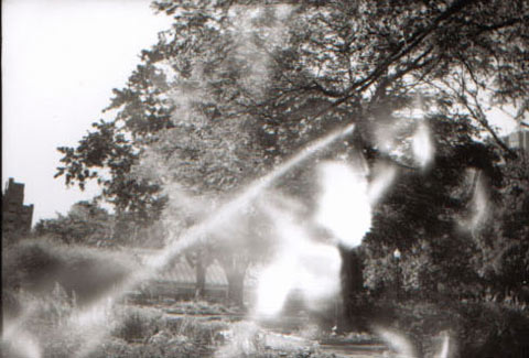 This is actually caused by light flares within the camera. I disassembled the lens to clean it, and when re-assembling, accidentally scratched the back of the anodized lens bushing, thereby exposing some of the metal that would otherwise be coated with a dull black finish to reduce flare. The resulting distortions are reflections from the scratch, bouncing around the inside of the camera gate whenever a picture is taken. (At least this is what I think causes it. I would prefer to believe that it is haunted, though.) These flares are more common with 120 and 220 medium-format films, and are caused by the film not registering properly (not laying flat), and reflections bouncing off the buckling film. They can also be caused by pin-hole light leaks in the camera or bellows. I've also been reading about the optical effects of scratches and defects on camera lenses. I bought some old Nikon lenses that were fairly badly scratched on the front elements. Depending on the severity of the scratch, it may not affect the performance of the lens that much, but is quite noticeable when pointed directly at the sun. The same is true with dust trapped on optical elements within the lens. If the sun is facing the camera, and the angle of the lens is just right, these scratches, or "chips" in the lens will cause bright "flares" or orb-like images in the picture, but only at that precise angle with the sun. Any other time, the lens works fine without any noticeable distortion.