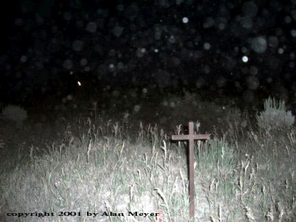 Alan Meyer (ameyer@networld.com) writes: This photo was taken this summer during a ghost investigation of the "potter's field" burial ground in Evanston Wyoming. Over 800 patients were buried here between 1880 and 1950. Ghosts are most often the spirits of those who died in a state of mental or physical anguish. The emotionally tortured souls who died here would be prime candidates for the haunting. The Evanston newspaper published this photo with a long article on the investigation. I took over 60 pictures here and orbs appeared in every one.