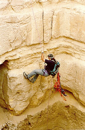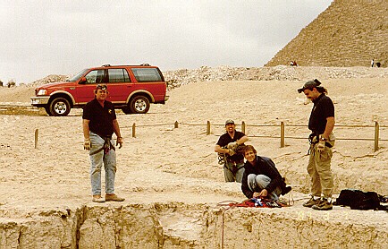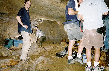 Here the film crew is investigating a deep cavern (left), and filmed an