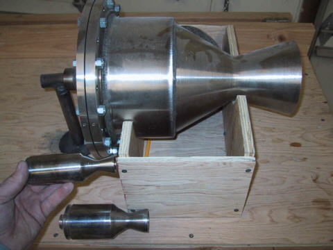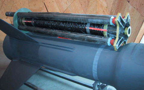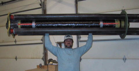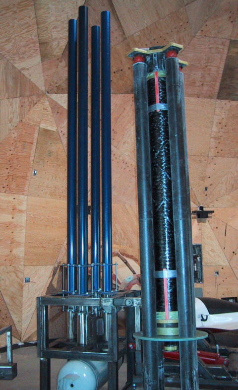 Photo Exhibits for the 3/28/02 program with Brian Walker, the "Rocket Guy." Brian writes: Here are a couple of fresh pictures showing the test rocket, fuel tank/launch sleeve assembly, and the 3500 pound thrust motor for the test rocket.