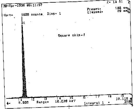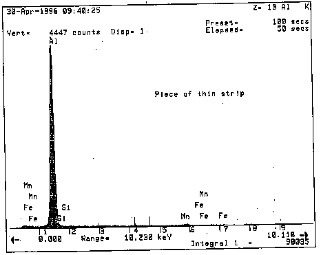 At this point, analyses have been conducted only on the square chips. Using a micrometer, a representative square chip had the dimensions: 6.368 mm x 6.361 mm x 1.596 mm. This gives a volume of 64.65 mm^3. Using a weight of 160 mg, this would correspond to a density of 2.47 mg/mm^3. The squares had two distinguishable sides: a "top" side with rounded edges, and a "bottom" side that was squared off --as if they had possibly been "punched out" from the top. Using a scanning electron microscope (SEM), photographs of the top side (photo 1) and the bottom side (photo 2) were generated. The SEM was configured for energy dispersive spectroscopy (EDS) which allows determination of the elemental content of the area being scanned by the electron beam. The bombardment of electrons results in the release of X-rays whose wavelengths are characteristic of the elements being targeted. A detector is able to translate this information into specific "peaks" which are then recorded. The analyses showed that over a broad (averaged) area on the surface of the top and bottom of the square chips (Figure 1 and Figure 2), only aluminum (Al) could be detected. It was also noted that despite the differences in apparent texture on the sides of the chips, the EDS spectra were essentially identical (not shown) -- i.e. only aluminum was detected in both the rougher and smoother portions. The density of aluminum is 2.7 and thus close to the value of 2.47 determined from our calculation. The curved top edges might contribute to the small difference. High magnification showed small granular particles embedded in the surface of the squares (photo 3 and photo 4). These had sizes of just a few microns (um). EDS showed that these contained silicon (Si) (Fig. 3). A square chip was embedded in epoxy, cut through the middle and polished in order to obtain a good cross section for SEM and EDS analyses. The SEM was done using a "backscattering" configuration which allows heavier elements to look brighter than less-heavy elements. Photo 5 shows that there are white (i.e. brighter) particulate flake-like materials scattered through the aluminum. These particles had a high iron (Fe) content as indicated in Fig.5 where the area measured was within a single particle. Small amounts of silicon (Si) and manganese (Mn) were also evident. The elements in these particles were not detectable when EDS was measured over a broad area of the chip cross-section (Fig. 4), presumably because of their small respective areas. 2. The metal strip.