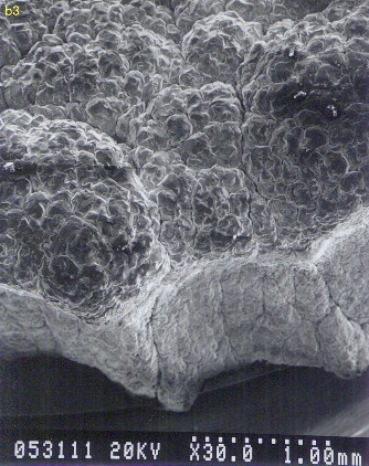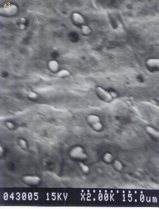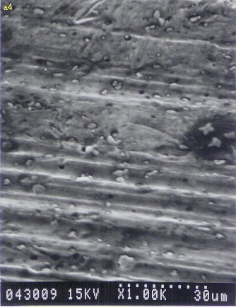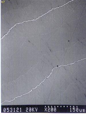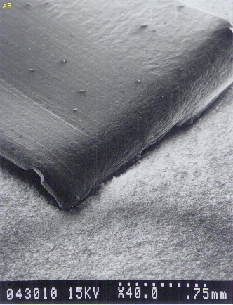 The slits are in 24 "groups" with 10 parallel slits one mm apart in each group. The lengths of the slits are 8 mm. When held up to the light at an angle, light can be seen through the parallel slits. The slits in each group appear oriented opposite to those in the adjacent group. That is, if considered to act in a vent-like manner, air going through the slits would be directed "up" in one group and "down" in the adjacent group. A small piece of the vent on one corner was removed for analysis. One edge of this piece corresponds to a slit edge. An SEM image is seen in photo 6. EDS showed it to consist primarily of aluminum (Fig. 8). This was similar for the three different sections that seemed to have a different textural appearance. Granules seen at high magnification exhibited the EDS pattern shown in Fig. 9. In this case the granules showed a content similar to the metal strip granules -- i.e. aluminum with small amounts of iron, manganese, calcium and silicon. Art's Parts -- The Skin(preliminary analyses)