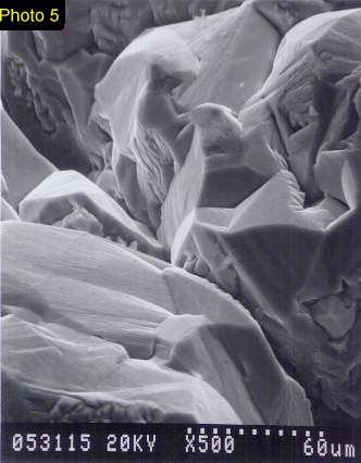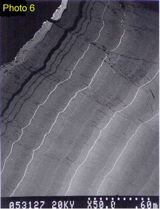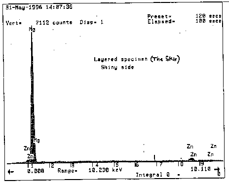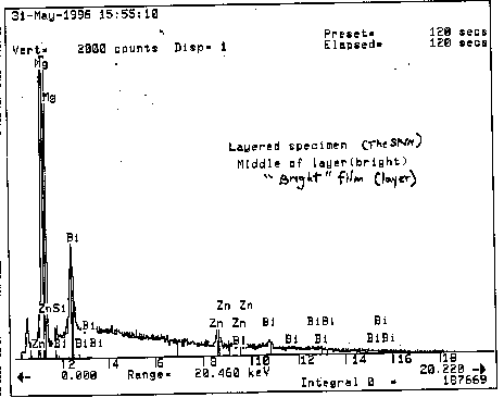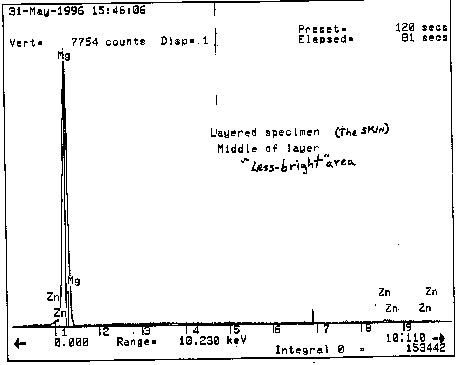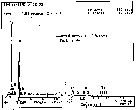 Each sapmle had a "silvery," shiny side with a rough (granular) appearance. The other side was blackish-gray. Looking at the samples edge-on, numerous layers can be seen. The samples were hard but brittle, and a few small pieces could be broken off using a small hand vice and manual pressure. Two such samples broken off were analyzed (side by side) by scanning electron microscopy (SEM); one was shiny side up-- the other was dark side up. Photo 2 shows a portion of both pieces; the shiny side up is in the lower right, while the dark side is in the upper left. Photo 3 shows the shiny side-up piece and includes a view of the edge where the layering can be noted. Photo 4 and photo 5 show higher magnifications of the shiny side. Energy dispersive spectroscopy (EDS) revealed the the shiny side contained more than 95% magnesium (Mg) and a small amount (2-3%) of zinc (Zn) (Fig. 1). The dark side contained a significant amount of bismuth (Bi) (Fig. 2). A small piece was embedded in epoxy, cut through, and polished in such a way that a cross section of the layering could be visualized. Photos 6,7, and 8 show images of the cross section at different magnifications. In these cases we utilized a backscattering mode which shows heavier elements to be brighter than less-heavy elements. As seen in the photos there are layers of lighter (less bright) material separated by much thinner layers of heavier (brighter) material. When EDS scans were done on the lighter material, a high level of magnesium was observed, again with a small amount of zinc (Fig. 3); whereas scans of the bright material showed a significant content of bismuth (Fig. 4). The thickness of the "bismuth layers" appear to be only a few microns. As seen in photo 6 and photo 7, there are apparent "bismuth layers" that appear less bright than others. Possibly this relates to a lower concentration of bismuth, or the bands occur slightly below the surface being examined. Additional studies will be necessary to determine which, if either, of these interpretations is correct. Thus the material appears to represent layers of a substance consisting mainly of magnesium and a small amount of zinc separated by thin layers containing a high bismuth content. END OF REPORT Transcribed by Keith & Mary Rowland from the original report received by Art Bell. Please do not copy this to other sites. Point all references here. |