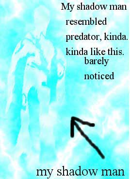 No. 19 - BHKeen@aol.com writes: This is my picture of my shadow person ,I am not sure if its a ghost or not I was in my bathroom brushing my teeth and saw him out of the corner of my eye. My son said tomy husband and I one time that he saw a man hanging from our tree in our backyard. He had been having nightmares at the time, so we associated this with that. whatever that means?.......I also have 2 cats who often sit in high places in my house, and act like they are gaurding, what ....I dont know. They dont act hostile or anything they just hang out.