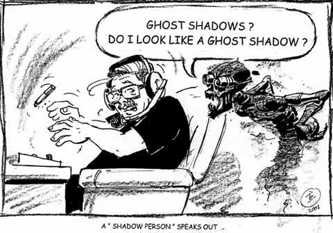 Steve Marks (Steve.Marks@mail.co.ventura.ca.us) sends us: I have made this animation to hopefully depict to others the experience that I had meeting a shadow person. I saw him kind of fade in from out of the corner of my eye, and when I turned my head, he vanished into the corner of the room. I rendered the scene in Flash 5, and it is a pretty small movie. Play Flash AnimationTom Schlosser (cirrus1@usinternet.com) Says: I'm trying to determine if what I saw, is GOOD or BAD. If Bad, this level of artwork may help others to recognize and avoid it. It is a group of them.