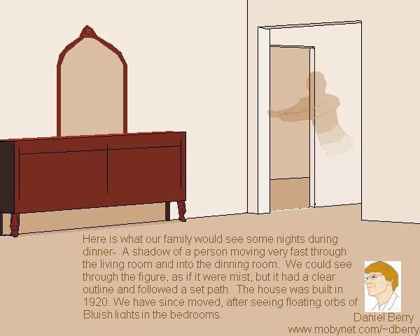 From: "Daniel Berry" dberry@mobynet.com This is a drawing of the sight that our family would see once or twice a month during dinner at around 8:30 in the evening. The figure never harmed us andÊ did not interact with us. It would just move through the house from the living room to the dinning room. Once it was seen moving from the dinning room to the kitchen. The entity moved through the air and was transparent. We moved to another house, after being spooked by seeing bluish orbs floating above our beds. The house is on "M" street, in Reedley, Ca. The new owner does not wish for the exact street address to be given out. We have not seen any activity in the new house. Was this a shadow person or a ghost?Ê