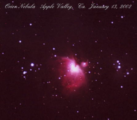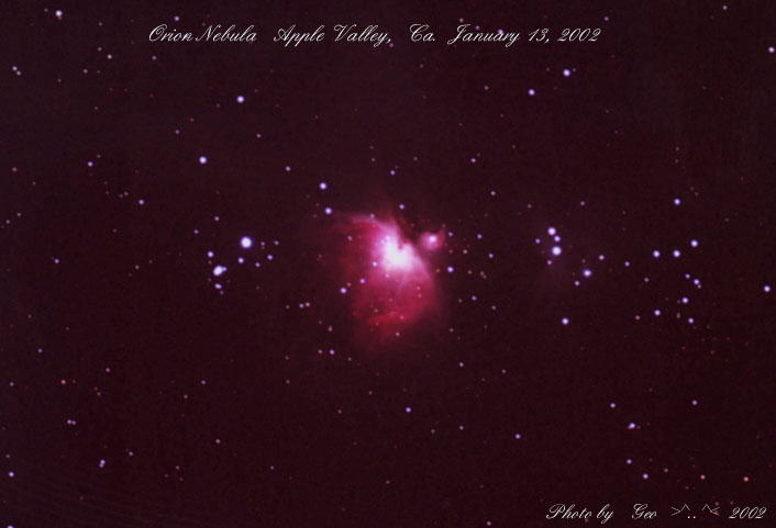 George in Apple Valley, Ca. (Orbitgeo@aol.com) sends us: I'd like to share a photo with you, my interest in Astronomy was recently 're-kindled' with the fact that a couple of co-workers purchased telescopes this winter. As I was bombarded with the usual questions, I decided to take up Astro-photography again and with the new equipment, it looks very promising. The enclosed photo was taken Saturday, January 13, 2002 from your own back yard (Apple Valley) Ca. Hope you enjoy it and keep doing the great job on your show. I'll be listening.