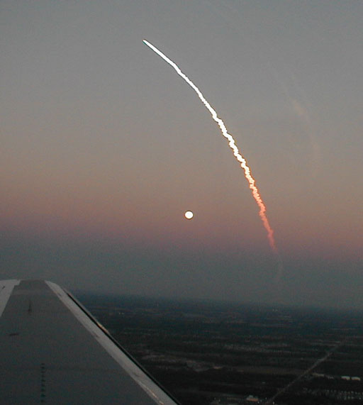 From: Amy Bell apbmcp@hotmail.com Attached please find a photo I took on a flight descending into the airport in Orlando on February 7, 2001. It's a year ago yesterday that I got this shot, how time flies...no pun intended. And to think, a shot like that will never be taken again, or as long as the airspace around the Space Center is restricted, which, I imagine, will be forever...