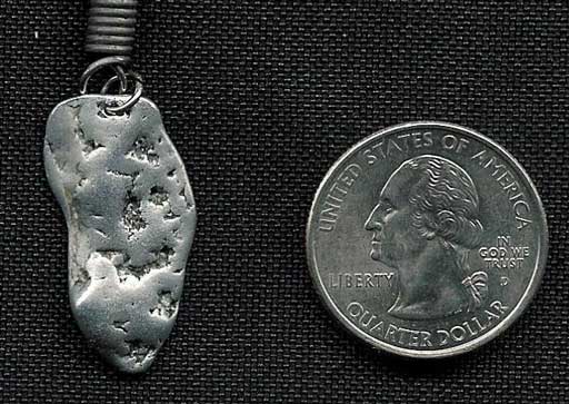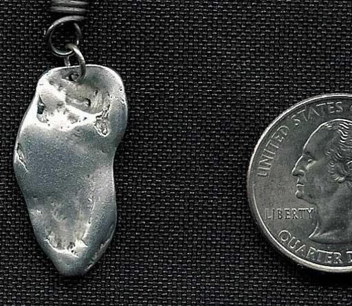 From: "Kel Wagner" bladester@frodo.com In view of the recent submission of space junk photos to your website, I thought I should share my favorite little piece of space junk with you. I found this piece on a beach near here in Sonoma County, California approximately ten years ago. It was not then, nor has it ever since, become tarnished in any way. It's clearly metallic and appears to me as though it hit water while it was still nearly in a molten state. I admit, I've never really had it examined by anyone aside from asking an astronomy instructor about it at our local community college. His only answer was, "Most people who think they have meteorites actually have 'meteor-wrongs'." He suggested I have someone in the chemistry department examine it to possibly determine its metallic content. I chose to make it into a necklace instead. It's made up of very hard, very difficult to bend metal as I understand titanium is. Titanium also doesn't really tarnish except to become a little bit more gray after prolonged exposure to the elements. This object seems to have those characteristics and just becomes more shiny with wearing.