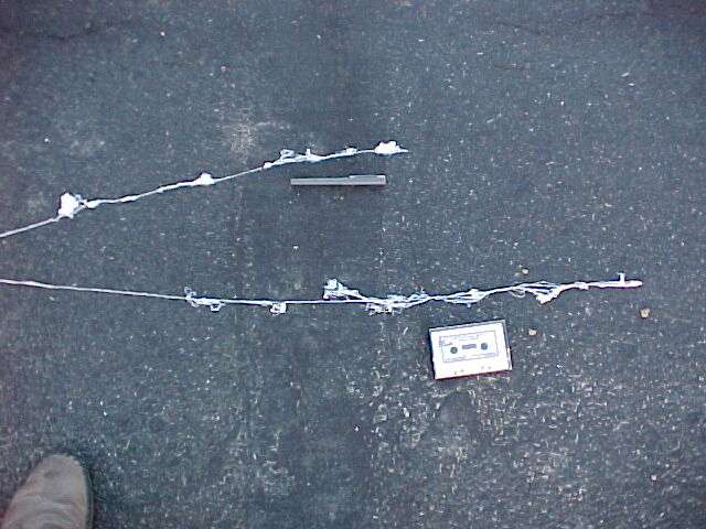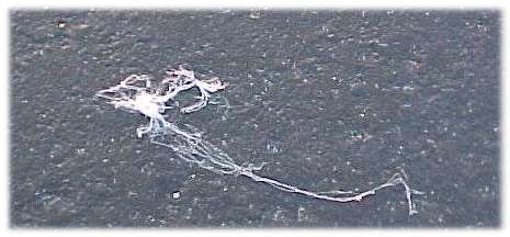 ![]() Thomas Brewer tbrewer@gci.net writes: While driving back to Alaska on Nov. 11th traveling up I-5 approximately 30 miles north of Sacramento and continuing to Red Bluff I saw a strange substance falling from or floating in the sky. I noticed strings of fiber like material of varying lengths, a few inches to many feet long (up to 50), floating at various elevations above the highway. After maybe 10-15 miles of seeing this and noticing some along the shoulders and on the roadway I stopped at a rest area and saw many strings of this attached to trees, signs, and on the lawn. I used a straw and twirled strings of it into a ball about the size of a golf ball and put in a drink cup with lid and put in a zip lock bag. That sample today is about half the original size. These ranged from clusters half the size of my hand, to rope like diameters ball point pen size, down to spider web size. As I collected the sample some of the thinner strings attacked to my arm and seemed to have a sticky, almost suction type attachment. A burning sensation followed for about 10 minutes after pulling off of arm, even after washing at rest area restroom. No apparent skin irritation appeared. One rope like strand, about 12-15 feet long was horizontal across the road at about 3 feet and stuck to my vehicle from the far left bumper, up across the headlights and grille and continued up across the hood to the bottom edge of the windshield. This is still visible today, although shrunk to a thin thread, however, it survived approximately 1,000 miles of rain and 1,600 miles of snow on the balance of the trip to Anchorage. I took the sample to a lab here in Anchorage and the CEO was amazed at it but said no lab here was capable of analyzing it and referred me to a lab in Colorado. He asked for my name and number (I thought that was strange since he couldn't help me) and the next morning he called me to say that I should be very careful with this material. He had done some research since I left his lab the day before and said similar substances had been collected in 22 states over the past year and he believed it could have some harmful bacteria associated with it. His estimate for me to get this tested was from $275 to $10,000. I am not able to do an expensive test but am willing to send sample to someone that can test it or has an interest in this sample.