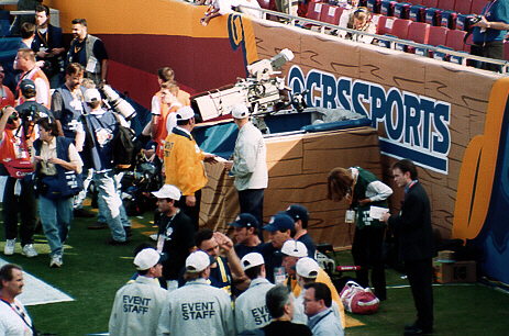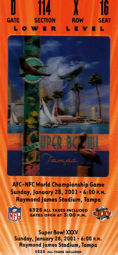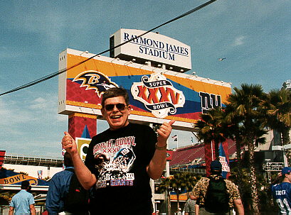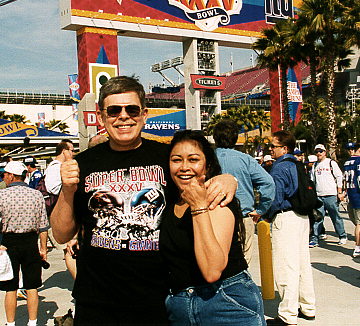 By the time I got back to Art, the gates were open and off we went to find our section. And in true form, we have to start our picture-taking fest, pictures of the crowd, action on the field, each other, background shots of the stadium, typical football fan snaps. Then Art mentions we should do a little souvineer shopping before the rest of the crowd in our section was seated. Little did I know that my big kid had his eye on a prize, a SuperBowl XXXV helmet. Guess who gets to carry it around and has to deal with the problem of stashing it away? You guess it, Me!