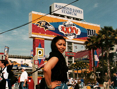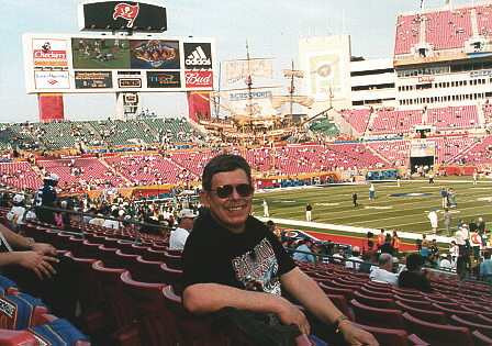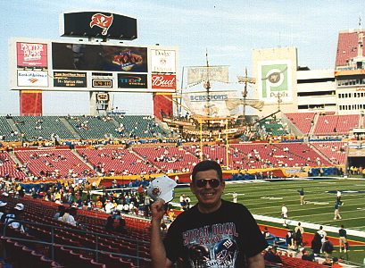 First hitch in our plan, Art had a back injury that did not allowed him to straighten up for two days. The second hitch, a long delay in Cinncinati due to a snow storm. With a few rather uncomfortable moments of turbulance to enhance our journey, we finally arrived in Florida. I found out that Tampa was not only host-city for SuperBowl, but was in the midst of celebrating their own form of Mardi Gras, The Gasparilla Pirate Fest. This week-long festival has been a part of Tampa history since 1904 and is normally held in February, but was moved to coincide with SuperBowl XXXV and its festivities. It seems the festival was built around the local legend of pirate Jose Gaspar and though little is known about his life or death, Gaspar accounts from his personal diary of the capture and burning of some 36 ships in twelve years, terrorizing the coastal waters of West Florida from the late 18th century to the early 19th century. It is not known whether Gaspar or Gasparilla ever invaded Tampa either, but once every year for the last 94 years, pirates have invaded the city of Tampa. This year's invasion of Tampa Bay was nothing less than spectacular. With seven hundred pirates of Ye Mystic Krewe of Gasparilla aboard, the Jose Gasparilla was escorted into the harbour by more than 1000 small boats and pleasure craft. A huge parade of pirates, floats and marching bands followed the invasion, throwing strings of beads and trinkets into the crowds that lined the parade route for three miles. It was estimated that nearly 750,000 people were in Tampa to celebrate both events.
