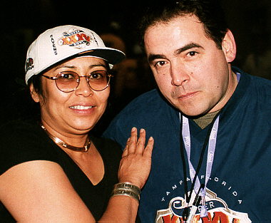 Art managed to capture the image of the B-2 as it flew by and most of the festivies on the field including the kickoff. I managed to yell myself hoarse during the entire game and nearly deafened Art in the process. Our hopes for a Giant victory however seem to grow dim when by halftime the score was Baltimore 10, Giants 0. But as luck would have it, during half-time I saw my favorite chef from the Food Network, Emmerel LaGasse, standing right in front of me. That's when I played fan and had Art ask him if I could have a picture taken with him. Now I have my prize and it's time to head back to our seats.