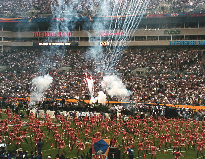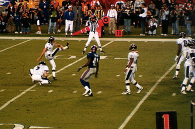 Now through most of the third quarter, the score remained the same until an intercepted pass to Wide Receiver, Amani Toomer by Defensive Back Duane Sparks was run 49 yards to put the score at 17-0, Baltimore. The Giants did score one touchdown on a 97 yard kickoff return by Wide Receiver, Ron Dixon. But when the Ravens scored a touchdown from an 87 yard kickoff return the next play, it was time to think about beating the crowd out of the stadium. The Ravens led 24-7 thoughout the fourth quarter, when the Giants allowed their 5th interception of the game. We collect our things and hike the two miles back to the car. But with the final score of 34-7, the Baltimore Ravens win SuperBowl XXXV, and we get to take some great memories home with us. -- Ramona Bell Return to Part I |