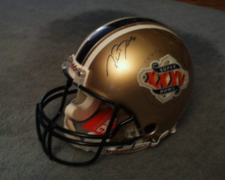 Part IINow it's time for a little snack before the pre-game show, so off I go for the goodies. When I get back with the food, Art was chatting with two guys sitting behind us. They were admiring his helmet and one of them had mentioned that Ronde Barber, Defensive Back for the Tampa Bay Bucaneers was sitting a few seats away from us. His twin brother, Tiki, is a Running Back with the New York Giants, and maybe with a little persuasion, he may autograph the helmet. So, encouraged by the guys to at least try, when I get back, Art wants me to run back out to find a marker pen. 15 minutes and five foodstands later, I have the marker. But guess who gets to ask this poor man, who, by every body language nuance, did not want to be bothered, for his autograph? That's right, Me! By now I have had enough and the start of the game is still thirty minutes away. But a smile goes a long way, and reluctantly, Ronde signed and Art had a true treasure.
