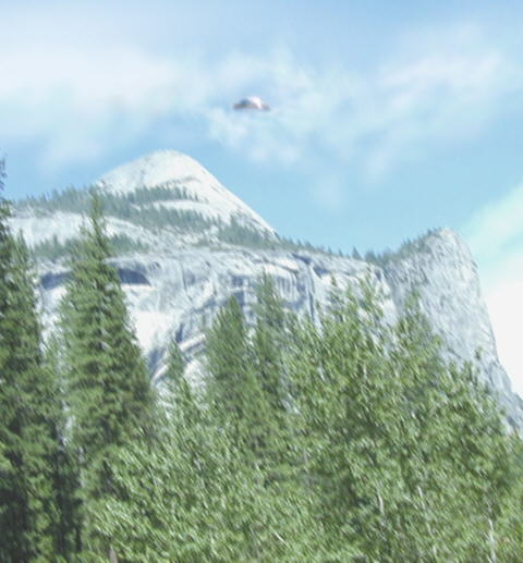 Andrew Boughton (andrewiseeyore@yahoo.com) sends us: I was visiting Yosemitti National Park this summer for my sister's wedding... it was a semi-clear day but some misty clouds came in twards the middle of the day. While I was photographing some mountain scenery a round shaped object came from the west. I tried to center on the "object?", and I jerked my camera... I think that's why it looks a bit blurry. Woudln't you know it that after I took that photo, my camara started rewinding... When I got home I scanned the photo. I heard about Art bell and looked up the sight... so I sized-down the picture (for bandwidth purposes), and sent it in. Don't know what it could be... thought at first it was a balloon covered with alluminum... but it was moving too fast i suppose. Looking at the photo, I can see that it is probably not a balloon.