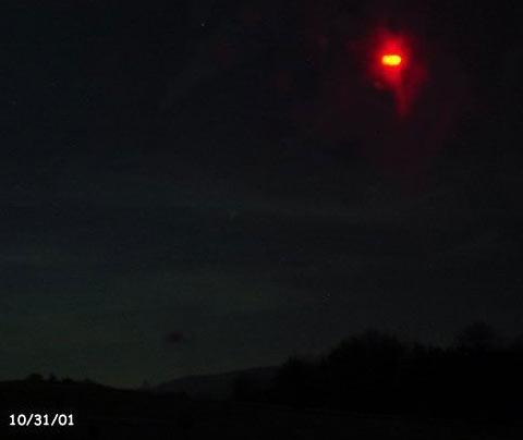Bill Marx (crazydog@meckcom.net) sends us: I am a truck driver and I travel mostly at night. I have been traveling to Kentucky for the past several years and I have always carried a camera (presently a digital Sony) with me. On Nov 1st, 2001, I was standing beside the road in total darkness about 3am.... there was no other light, except for the moon.... I wanted to take a picture of the quarter moon over the mountains in West Virginia and as I took the picture I noticed a red light in the sky beside the moon and over the side of the mountain. I figured it was an airplane, but it was not blinking and it moved kind of strange and also there was no sound........... I took a series of pictures as it moved toward me and then it jumped back away from me and then sort of zoomed off to the distance. I have no idea what it was but I thought you might like to see these..... it sort of gave me the 'willies', and I have never seen anything like it before or since.