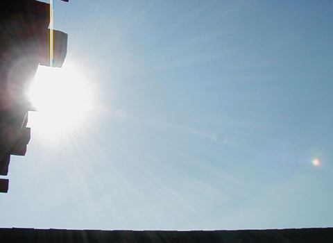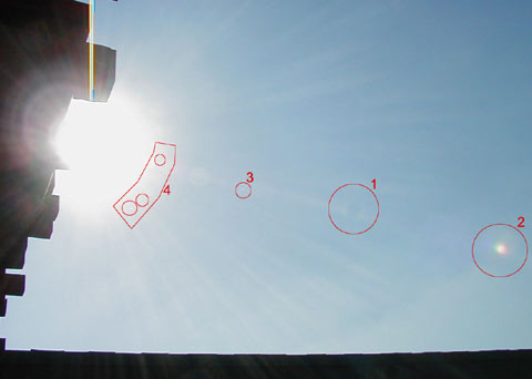 George Durham, San Diego, California (NSTYLES@email.msn.com) sends us: A few weeks ago, I watched a show on Sightings that introduced a new way of photographing ufo's. It's called solar obliteration. Originally, the guy who told sightings about it (I can't remember his name) did this with a video camera, but I thought it might work with a digital camera as well, so I tried it. This morning at about 11:30 a.m. I went into my backyard with my digital camera and used the overhang of my house to block the main portion of the sun (kind of like an artificial solar eclipse). I took a few snapshots, and this is what I got.ÊWhen I took the picturesÊno objects appeared in my lens view, but when I dowloaded the photos to my computer, this is what was there! It looks to me like a round ufo (2) is just coming out of perhaps some type of wormhole (1) andÊon the other pictures you can clearly see silver ball objects, especially closer to the sun! Now, when I saw the Sightings show, the guy said that the idea behind this trick is to block out theÊ center of the suns ultraviolet rays, and that this would reveal the objects. Apparently, they hide in the suns ultraviolet rays, and that is why we can not see them in daylight usually. But, if you remember back to the last Solar Eclipse, there were a rash of sightings all over the world, especially in Mexico city. I cirlcled all of the objects for everyone to see. I did not change these pictures in any way shape or form. These are the original photos I took downloaded directly from my camera into my computer. I had never seen anything that even closely resembled a UFO before this, and I've even been out to Area 51 several times! I am definitely convinced that UFOs exist.