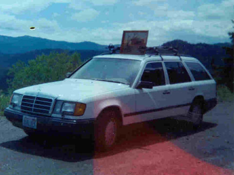 Louise Weed (LWeed@PacificVascular.com) sends us: My husband just got these developed. He didn't realize there was a red light which had bathed him while taking the photo. He was coming home from a business trip in Spokane. He took the Ellensburg to Wenatchee highway route, then decided to take the Old Blewitt pass highway over the tops of the mountain ranges - about 1 p.m. There was only an occasional forest service vehicle around. Something kept "buzzing him" but he thought it was a forest service drone. He had bought a picture from a farmer in the valley and took a rest break up on top of the range and took the picture out to look at it. Then he was buzzed again by this shiny object. He managed to snap this photo but then forget all about it. If you zoom in on the object, it looks like a tail or exhaust coming out the back.