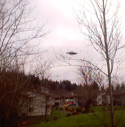 Trent Lochlier (trentlochlier@yahoo.com) sends us: This was taken on 2/7/02 by my neighbor during a bar-b-que. We all live in an apartment complex in Issaquah,WA. I was at work at the time, but many of the residence who witnessed it said no one knew it was there until someone shouted "look!". Scott, my friend who took this picture, said he was only able to take one picture before the craft zipped away to the north in a fast streak. The picture was taken with an Intel Pocket PC digital camera.