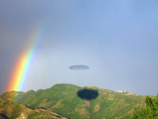 NOTE: Remember folks, we don't insist any of these are real, but are posted for your enjoyment and consideration. We post what the submitter claims. We leave it up to you to decide what is real and what is phoney. From: Name Witheld I hesitate to send you this as I don't wish to be in the spotlight. Attached is a picture from a friend of mine who works in law enforcement here in SLC. He describes looking atÊa beautful rainbow in the mountains just to the east of Sugarhouse ParkÊ(SLC) here in UT. He always keeps a digital camera with him and was just putting the eyepiece to his eye to take the rainbow when he saw the saucer thing in the as well. He says it was not quite as it seems, where we're really looking at the under belly which was maybe half the distance between his patrol car in the park and the mountains where the picture makes it look as if it's kind of diving down and closer to the mountains. Anyway he said it was just there, and huge and he snapped this shot fast. Apparently these digital cameras have to wait to take breath between shots and so in the few seconds it takes to do that it headed east over the mountains but not too fast he says, just enough to be missed by the camera. He waited to see if it would return while listening on his radio, but no reports came in to his dismay. He really wanted toÊcall dispatch but was not sure, so he didn't. He said because he was looking through the camera it was as if it wasn't really happening, yet he had the picture to prove it. Later he confided in me and we were more scared of telling humans about this than whatever it was! I thought you might like to see it. I trust him, but you never know. You are the expert he seemed really worried which is why it took him this long to tell me. Please don't use my name, as they would know him by me in the department.