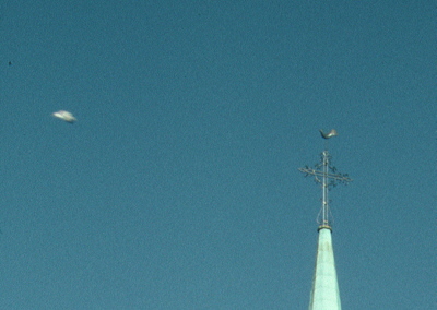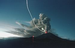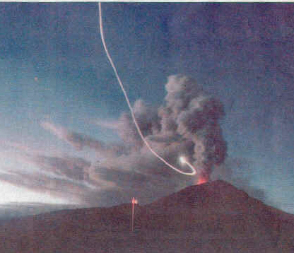 Incognito Light. This photograph, which shows a strange descending light that seems to turn quickly when approaching the crater of the Popocatépetl, was taken Tuesday, December 19, 2000, at 6:10 hours, with a prolonged exposure of 20 seconds, an apature of 4.0, and a lens size of 24 millimeters. Photo: Alfonso Reyes / Notimex. Hunter (Overlord@alienbabyhead.com> writes: