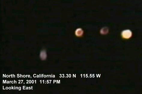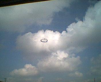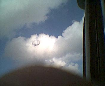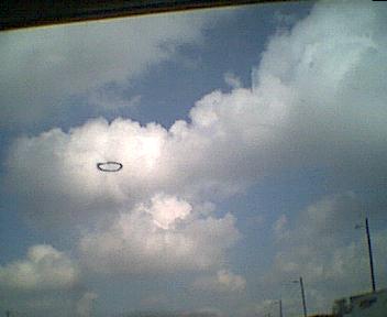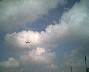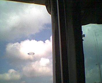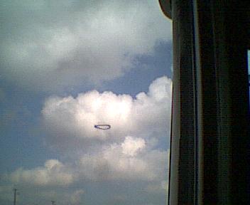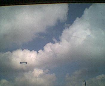 Mike Gingrich (GINGO2@aol.com) writes: I was outside tonight when I saw at least 15 bright lights in the Eastern Sky. Very bright and "Glimmering." There was no sound what so ever. There is no way it could be an airplane/s, to be planes there would have had to been many flying close together in the same direction at the same time and there was no sound as is evident in the video I took. The lights were so bright, there would have been sound had it been a conventional aircraft/s. I went in to grab my camcorder and went back outside and then there were only 4 lights left in the sky. I video taped them. At first, in the video, you see two lights on the left. These are ground lights in the neighborhood and to the right are the "Glimmering"Lights. Now only 4 left. I taped them above the oleanders. The oleanders above the lights are 6 feet tall. I'm also standing under a ficas tree. I video taped the lights then zoomed back and wanted to get on the other side of the oleanders. I shut the camera off then there was a bright light (a flash) light lightning directly over my head. I walked towards the oleanders and turned around to look above the ficas tree and there was nothing but stars. The lights were gone also. Keith A. Hamblin (keithhamblin@hotmail.com) writes: I am a local truck driver in the Salt Lake City, UT area. Today, 3-1-2001, I was traveling north on Beck Street in Salt Lake City toward Woods Cross and something seemed to flash through the upper part of my windshield. I looked up and whatever was moving was no longer visible but what remained was very strange. One image shows telephone poles and the top front corner of a semi trailer in the bottom left corner of the picture. These may give an idea of how far and how large this thing was. I'm no expert at such but I estimate it was about 3 miles to the north of me.