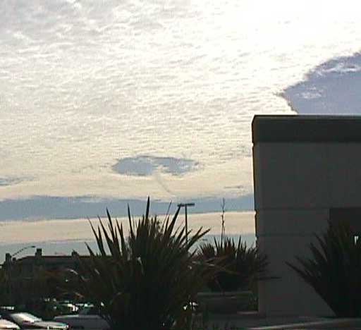 From: MReyes8816@aol.com You had two pictures called Cloud vortex dated 06/05 on your site. I thought they looked very interesting. I have seen this cloud formation February, 8 - 2002 at about 10:30am over Dublin California. When I first saw it, it was just like a giant had taken a cookie cutter and cut a prefect hole in the clouds, with a vortex (not spinning like an upside down Christmas tree) perfectly centered in the middle of the hole. It took me about 10 to 15 minuets to find a digital camera so that I could document this very strange anomaly. The cloud cover seemed to be very low and the cloud (crop) circle was almost right over my head, buy the time I took the picture it had moved some distance away and had lost some of it shocking perfection. Could it be something to do with the saying: Signs on the earth (crop circles) and in the heavens (cloud circles)?