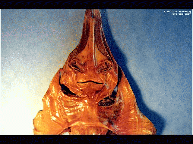 Three pictures of skulls of unknown origin, compared with modern human skull,